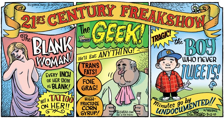 I'm proud to present to you today one of my favorite cartoons in ages. The 21st Century Freakshow is brilliant, and I can say that without fear of immodesty because I didn't write it. (Damn!) I think I did a good job of drawing it (be sure to click it to see the larger version) but the original idea and sketch, pretty much in this form, came from my brilliant friend, colleague, and occasional collaborator, Wayno. I hate his guts. And I l...