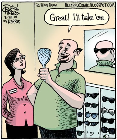 Bizarro is brought to you today by The Best 70 Bucks You'll Ever Spend.So what's the deal with people who wear their sunglasses on the back of their head? Is this the logical extension of the backwards baseball cap? For me, both of these trends show a small glimpse of the the sort of utterly nonsensical behavior humans are uniquely known for. Baseball caps have bills on them to block the sun, so let's wear them backwards. Sunglasses were invented to protect our eyes, so let's put them on the ...