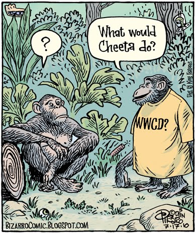 The first comic includes a reference to Tarzan's Hollywood sidekick, a chimp named Cheeta. Cheeta's shirt is a satire of the popular middle-American saying, "WWJD?" which stands for "what would jesus do?" Popular with Christian teens, I suppose it was invent...