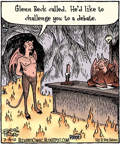 Bizarro is brought to you today by The Face of Fear.Although I admit that I think Glenn Beck is a dangerous lunatic, I didn't see this cartoon as particularly partisan. Mostly, it is just meant to describe Beck as someone who believes in The Devil and would debate him if he could. Both of which I'd guess are true. And most readers did not take offense or I would have gotten more complaints. As it is, I only received one comment on this cartoon and I'm not sure it was even a complaint, per se....