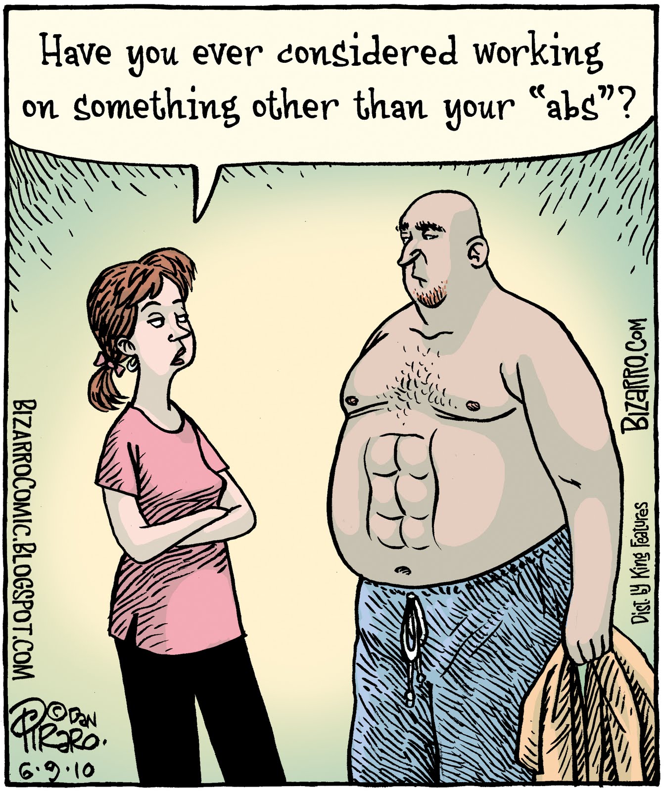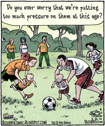 Bizarro is brought to you today by Labor Pains.I like this cartoon because I don't like people who take their kids too seriously. It is natural to think your baby is special: smarter, cuter, cleverer, stronger, faster, quicker, more intelligent, more talented. It's fine, it feels good, it's as it should be, but it is important to realize that it isn't true. It is a simple trick of evolution. If we weren't irrationally in love with our own babies, we'd kill them the first time they woke us ...