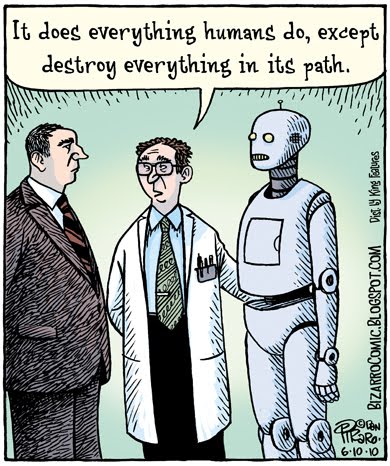 Two more cartoons today, what a week it has been for more than one cartoon! First is the robot cartoon that comments on our species' regrettable ability to destroy everything we touch, usually for important reasons like personal comfort, sensory pleasure, and convenience. It's not like it's ever going to stop, but then neither will I stop complaining about it so maybe that evens out.
