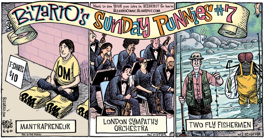 I'm off to Woodstock in a few minutes for our June Jamboree, so I don't have much time. Here is the seventh of my Sunday Punnies series. If you want to see your pun in the paper, send it to me via email (see Bizarro.com for addy) or leave it in the comments section of one of my blog posts. It must be original – I don't want to do puns that have been floating...