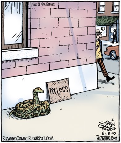 Bizarro is brought to you today by The Dangers of Farsightedness.Here's a pithy little cartoon about a homeless snake. The kind of snake I've drawn here is more like a constrictor, which I don't think actually care for pits, but drawing a tiny viper didn't seem right for the composition. I don't actually know much about snakes so feel free to educate me in the comments.