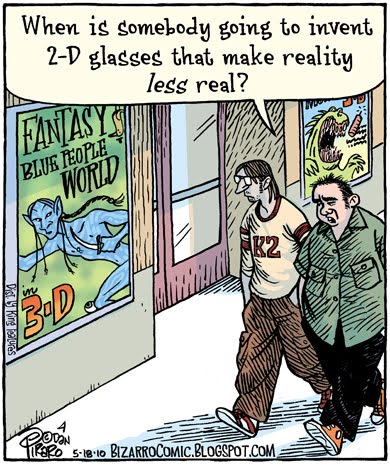 I was among the zagillions of people who saw the Fantasy Blue People World movie in 3-D and really enjoyed it. I can't say I enjoyed it so much I want to get my ears surgically altered, grow a ponytail and paint myself blue, but the world they created, when experienced in 3-D, was, as the kids say, awesome. I'm not sure how much I would have liked it in 2-D.