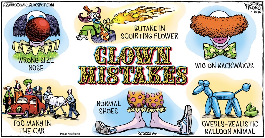 Here's another post with a two-fer, to make up some ground on the cartoons I didn't post while away. I really like cartoons like "Clown Mistakes," ones that are outside the usual formula of one-panel comics. More like a chart or diagram than a scene, my hero, B. Kliban was a genius at this kind of joke and the first person I ever saw employ this style.