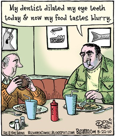 Bizarro is brought to you today by camouflage.One of my father's-in-law and I were driving through Florida recently, saying things with our mouths and we came across this idea of having your eye teeth dilated. So I made a comic about it. I'm blessed with funny in-laws all around, so it's fun to visit CHNW's family.