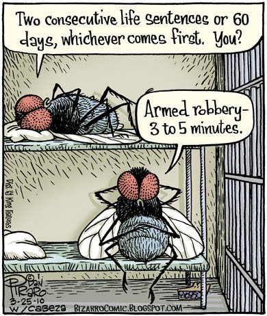 Bizarro is brought to you today by Olympic Athletes of Other Worlds.Today's cartoon is a collaboration between my friend, Richard Cabeza and I. We were discussing how short fly's lives are and then came to the idea of appropriate jail terms. We didn't actually bother to look up the lifespan of the common housefly, of course, that would have been too much like work. One of the nice things about being a cartoonist is that nobody can really hold your feet to the flames about inaccuracies. "It's ...