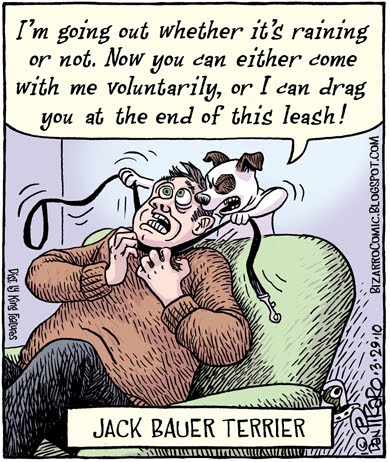 For readers familiar with the TV show "24," this cartoon is self explanatory. If you're not, Jack Bauer is the preposterous, soap-opera-style hero of the fictional Counter Terrorist Unit of the U.S. government. He is a combination of James Bond and Batman, all wrapped up in the 5', 4", elfen body of Kiefer Sutherland. Bauer gets what he wants by threatening and torturing people, not unlike a Jack Russell Terrier.