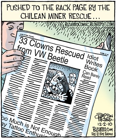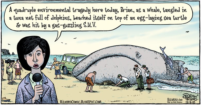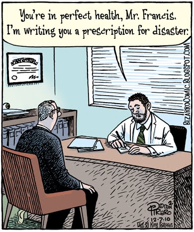 Bizarro is brought to you today by Xmas Celebrity Sightings.Since we humans are so prone to superstition and mysticism, I could easily attribute the harrowing accident involving my wife and a taxi cab on December 10th to my cartoon that ran in newspapers on December 7th. It was undoubtedly an unwitting premonition, perhaps even a prophecy. I'll think twice before I use terms like "prescription for disaster" in Bizarro again. Whew!