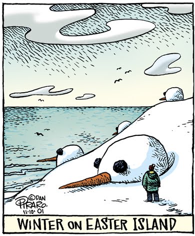 Our last cartoon documents a mystery upon a mystery. Archeologists are still uncertain as to the origins of the large stone heads on Easter Island, and even more mystified by their replacement each winter with big whopping snowman heads. Government officials have declared the island off limits to tourism during these months fearing vandalism of the heads, which are notably more fragile than the stone ones. Samples of the snow are gathered by scientists each year and guarded carefully as they look for clues to its provenance. Theories of the origin of the frozen craniums range from intervention by extraterrestrials with a juvenile sense of humor to ghosts of the children of the indigenous inhabitants who erected the stone heads visible throughout the rest of the year.If you have a strange winter mystery that you think would make an interesting cartoon, write it on a 3"x5" note card in 200 words or less and mail it to: