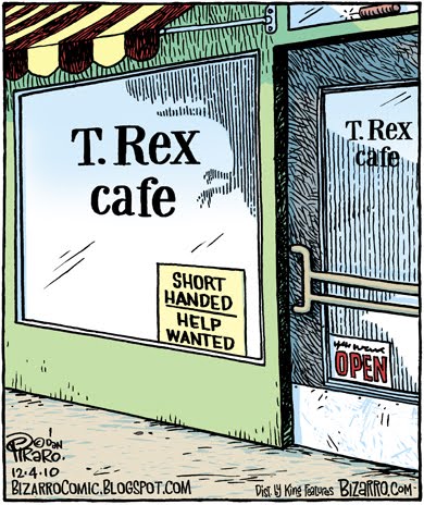 T Rex has no superstitions, he just needs help in his cafe because he is short-handed. Get it? Short handed? What kind of damn fool dinosaur starts a cafe if he cannot even carry a tray without dropping it? And what does he do with the tables of patrons he knocks over with is mighty tail? Perhaps he just eats them. T Rexs can be like that.