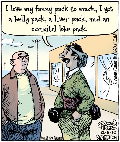 My fanny pack riff got a few emails from readers with a better knowledge of anatomy than mine who informed me that the "liver pack" is on the wrong side of the man's body. What we actually have here is a "spleen pack." My bad, as surgeons up on malpractice charges frequently say.Of course, if you want to get really picky, the "belly pack" is actually an "intestine pack." The stomach is much higher. Unless you want to be extremely liberal in your interpretation of "belly," but don't even get me started on that kind of irresponsible artistic license. Cartoons should be as factual as possible. If you can't trust the information in a cartoon, what can you trust?, I always say.