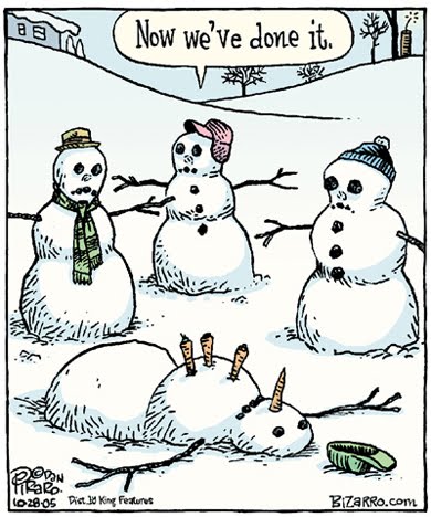 We begin with this cartoon based on a true story that happened in Cheboygan, Michigan in 1983. It seems that a small group of 9-year-old boys built four snowmen on Thursday, December 15th. When they returned to the site the following day, exactly 27 years ago today, one of the snowmen had been murdered by the other three, their carrot-nose murder weapons still sticking out of the gaping wounds in his chest. By the time the police arrived, an unidentified rabbit had eaten all three of the carrots and left the scene. Authorities arrested the three suspects but they disappeared from lockup over night and have not been seen since. The rabbit, a suspected accomplice, remains at large. Snowman-on-snowman crime, however, is not uncommon and most cases go unsolved.