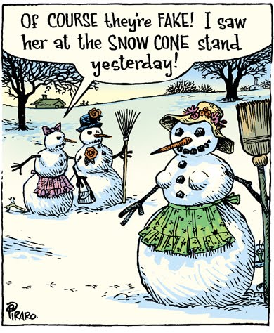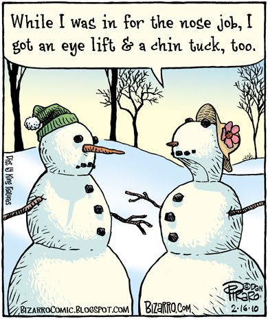 Our next cartoon features the growing trend among snowpeople toward cosmetic surgery. Though exact statistics are impossible to gather, experts estimate that nearly one quarter of all snowpeople in the U.S. are using elective surgery to make themselves more attractive. Snow cones are a cheap method of breast augmentation and sales of "baby carrots" are up 130% in the past ten years, presumably to achieve a more attractive nose than the traditional full size, adult carrot. Snowmen have been known to use parsnips for penis enlargement, though their proximity to the ground have led to some thefts.