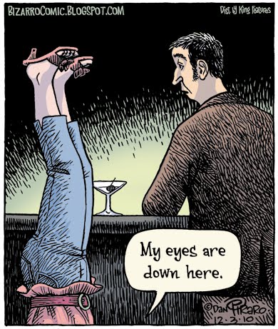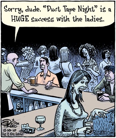 Bizarro is brought to you today by Duct Tape.I'll be honest with, I'm really fond of "Duct Tap Night." Not as an institution, but as a cartoon. I'm not fond of bars in general, the liquor is far more expensive than what I have at home, the music is typically too loud to have a conversation, and I'm not looking for a new sexual experience. It would be fun to meet a friend in a bar and catch up, but quiet bars are increasingly difficult to find and I have no desire to scream at my friends. So I tend to stay home where the drinks are cheap, the music and volume is of my own choosing, and the hot women (wife) will actually go to bed with me.