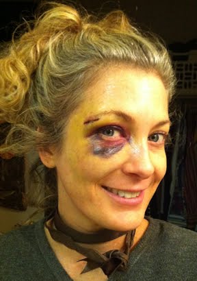 Picture two was taken at home the following day as she lay in her luxurious four-poster bed, ringing a tiny bell every few minutes to summon me to help her because she was "dizzy" or "weak." What a big baby. Sometimes I had to get her a glass of water, sometimes a cup of soup, which entailed my peeling the paper lid off of a cardboard container and pouring hot water into it. You can't believe how hard it is to walk into the next room with one of those things without spilling it. Meanwhile, I had to make my own breakfast, lunch and dinner for two solid days! Now I know how Civil War nurses must have felt. No thank you, Clara Barton!*She took this picture partly because she thought that the purple of the "boxer's eye" really set off the blue of the unmolested one. I couldn't agree more, that one side of her face has never looked lovlier.