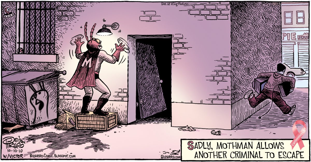 The Mothman cartoon was a collaboration with my young teenage friend, Victor. It's colored that sickening pink because it was part of a breast cancer awareness project that King Features sponsored. All of King's cartoonists were asked to color their comics pink on Sunday, October 10. They asked me to do the poster for it. I'm not a fan of cancer research and don't like supporting it monetarily because a lot of that money goes toward torturing lab animals. If humans ate vegan diets there would be substantially less cancer, but rather than inconvenience ourselves or stop doing something we enjoy, we torture and kill millions of innocent beings every year in an attempt to find ways to survive eating the wrong foods. In spite of my objections, I participated in this project because it doesn't give money to the cause directly, but mostly reminds people to get screenings so they can catch it early. Just my take on it, whatever.