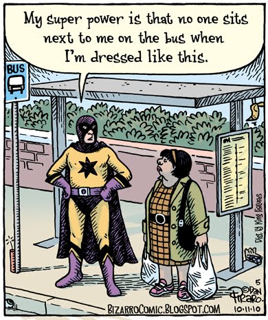Because I'm compiling cartoons for my super hero collection coming out in the spring, I'm still writing super hero gags. The one about the bus is a fantasy I've had many times. I loathe sitting next to strangers on public transportation, especially talkative ones, and will do almost anything to avoid it. I'm a friendly guy, but I can't stand small talk and think few things are worse than sitting next to a chatty traveler on a long flight.