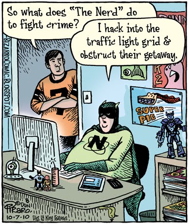 My last cartoon today is about a super hero calling himself "The Nerd." After this was published I thought I should have had a funnier line as a response. Something like, "I fill the inboxes of criminals with lame jokes." I'll likely change it to something like that for the book of super hero cartoons I have coming out in the spring.Must get back to deadlines now, dear reader, for I am off to Columbus on Friday for Ohio State University's Festival of Cartoon Art at which I am a speaker.
