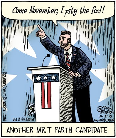 Speaking of catastrophe, I'm trying hard not to worry about the elections in a couple of weeks. I know that Americans will just hand the country back over to the party that took eight years to ruin it because the current party couldn't fix it in two years. It's a done deal. So I'm telling myself ahead of time that it's already happened, things will get worse, humans are a deeply flawed species, someday I'll die and none of it will matter.Maybe I'll be surprised and American voters in sufficient numbers will just say no to Fox News, but I think that's unlikely so we might as well have some fun with it and elect a Mr. T impersonator or a masturbation-opposing witch. As long as you're destined to listen to morons on the news for x number of years, you might as well go for the craziest ones possible. That's entertainment!