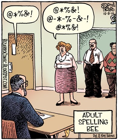 About this passel of cartoons I've posted today to catch up: "Adult Spelling Bee" is an idea I originally published in the 90s, I think. I came across it in my archives while looking for something else and thought it was a good idea and could be done better with a little tweaking, so I rewrote it a bit and redrew it.