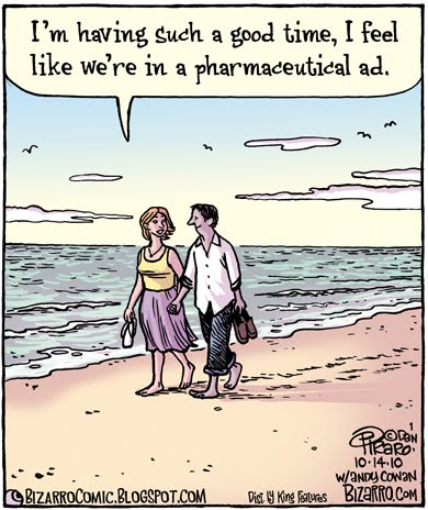 What could be more blissful and relaxing than living in a pharmaceutical ad? You feel no anxiety, you don't have to pee, you can get an erection any time the mood strikes and you can eat like a pig without worrying about your cholesterol. Of course, there are encyclopedias of terrifying side effects to consider, but those are only represented in the dulcet tones of the voice over. Nothing bad ever happens in a pharmaceutical ad. Count me in!