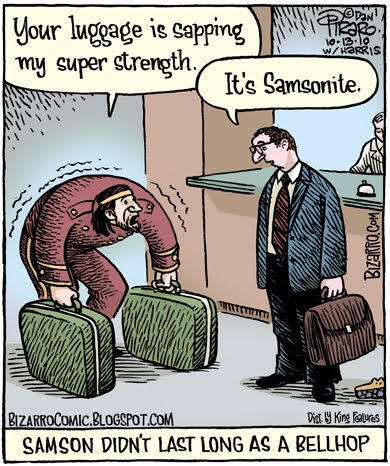 Less euphoric is the world of luggage transportation. Even with the unbelievably recent addition of wheels (we've had luggage and the wheel for tens of thousands of years and it was the late 20th century before anyone thought to combine them!) one still has to schlep one's luggage up and down stairs, into cars, over curbs, onto the scales at the airport, etc. If I'm traveling with the full 49.9 lbs suitcase, I always return with a backache. One would think the legendary strongman, Samson, would be immune to such human weakness, but along comes Samsonite.
