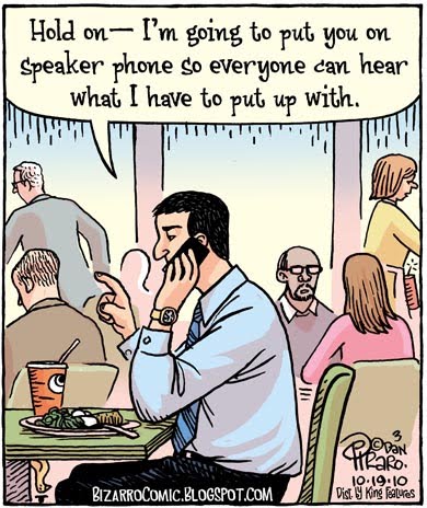 On to the next cartoon: I thought of this gag when trapped in public on my cell phone during a difficult conversation. I wanted to scream but did not wish to abuse the others around me. And no, it was not a conversation with CHNW.For today's blast from the Bizarro archives, click on the No One Zilla link in the first sentence of this post.