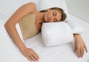 Sleep on your back or on the side that feels no pain. Placing a pair of pillows under the sore shoulder can also help.