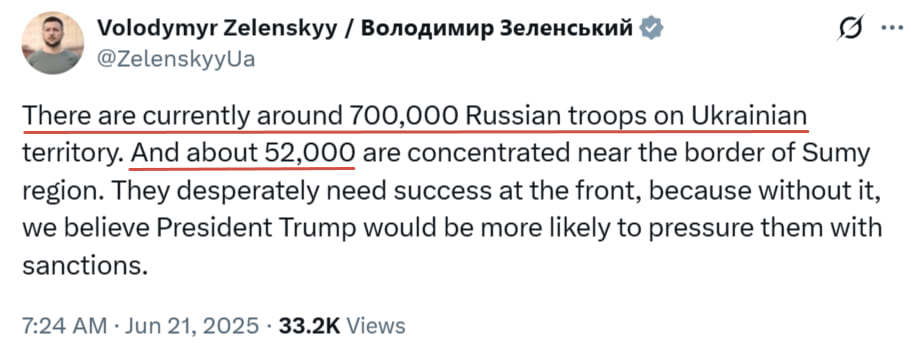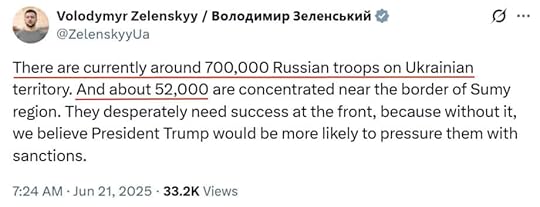2023: Bloomberg announces Russian troop count at 420,000.2024: Head of Ukraine’s military intelligence tells Economist the number had swelled to 514,000.Early 2025: It was 600,000.And what do we have now, at the midpoint of 2025? Straight from Zelensky’s own mouth: