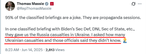 We do know MediaZona has a ‘lag’ because it takes time to confirm most recent deaths, and so the number will likely rise, but probably not by an inordinate amount. There is no evidence whatsoever that Russia is taking anywhere near the kinds of losses the West claims. In fact, someone made a good point: since it is Ukraine that purports that 70-90% of their kills on Russian soldiers come by way of drones, they should be able to show all these vast amounts of losses via drone camera recordings; yet there is nothing—and we know the AFU loves nothing more than showing off its ‘successes’.