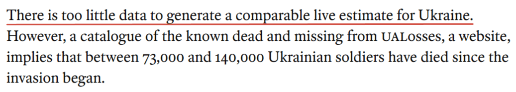 These publications claim to have such ‘sensitive’ attunements to the battlefield fluctuations as to give exact Russian figures, but when it comes to Ukraine, they are suddenly lacking data.