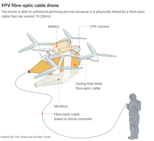 Not only are FPVs “dramatically” striking ever-deeper into Ukrainian territory, but fibre optic FPV drones have gained “dark prominence over the killing fields.” While emulating the quadcopters equipped with munitions typically deployed by both sides previously, this “highly manoeuvrable killer drone” is connected directly to pilots by “a gossamer thin fibre optic thread.” This makes the contraptions difficult to track, and impervious to electronic jamming. A local infantry battalion commander told The Times: