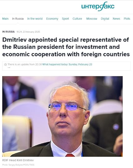 Apparently Dmitriev has been doing exemplary work, because on February 23 Putin appointed him “special representative of the Russian president for investment and economic cooperation with foreign countries”.