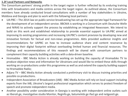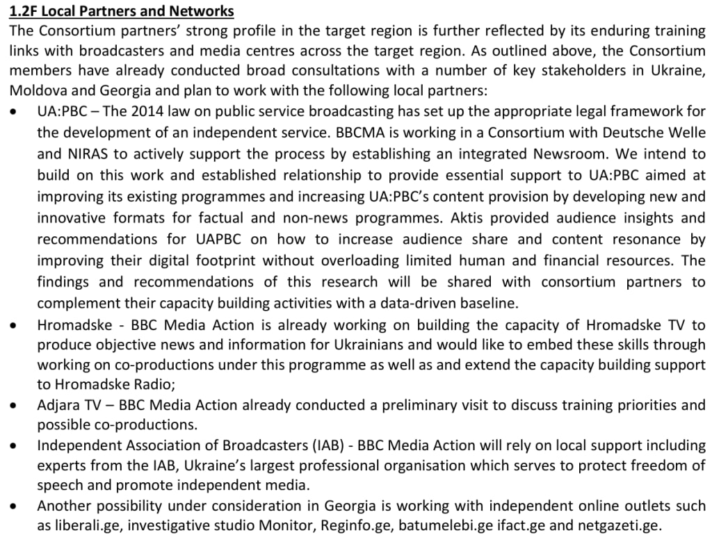 BBCMA and the Thomson Reuters Foundation (TRF) operatives met in private every four months to discuss the operation’s progress with representatives of the Foreign Office, and British embassies in the three target countries. In advance of the project, the pair leveraged their “strong profile” in Georgia, Moldova, and Ukraine to conduct “broad consultations” with neighborhood news outlets, media organizations and journalists.