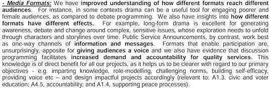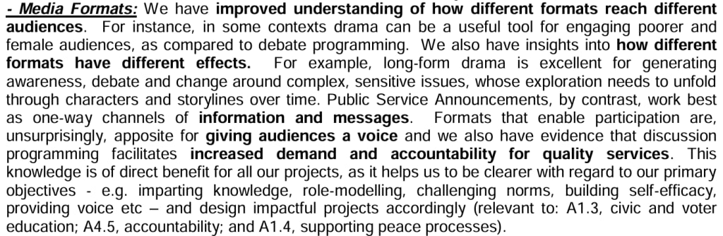 “We recognise that different formats achieve different things when it comes to change… and consider audience needs, objectives and operational context when deciding which format to use,” BBCMA asserts in one file. In another, the organization crows, “people exposed to our programming are more likely to: have higher levels of knowledge on governance issues; to discuss politics more; to have higher internal efficacy (the feeling that they are able to do something); and participate frequently in politics.”