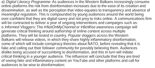 Also among the proposals were so-called “Citizen Content Factories,” consisting of “two-week long, highly-publicised, content creation camps” in the Western Balkans. These British-backed summer camps would “bring young people from across the region together for a YouTube training and partnership camp that will teach young people to become content producers” as well as “provide a very public programme of activity that will improve the perception of the UK.”