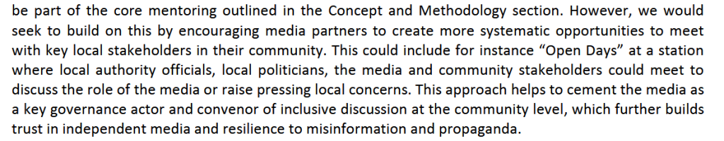 Meanwhile, BBCMA visited the offices of Georgia’s Adjara TV “to discuss training priorities and possible co-productions.” The station was especially keen to develop “youth programming” – “a gap in the market” locally. BBCMA and TRF furthermore proposed to tutor and support ostensibly “independent” online Georgian news portals like Batumelebi, iFact, Liberali, Monitor, Netgazeti, and Reginfo. “Local” and “hyperlocal” media platforms, as well as “freelancer journalists,” bloggers and “vloggers” were also considered important targets. “Mentors” were “embedded” in target outlets, providing “bespoke support across editorial, production and wider management systems and processes as well as on the co-production of content.” Those “mentors” included current and former BBC reporters.