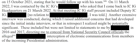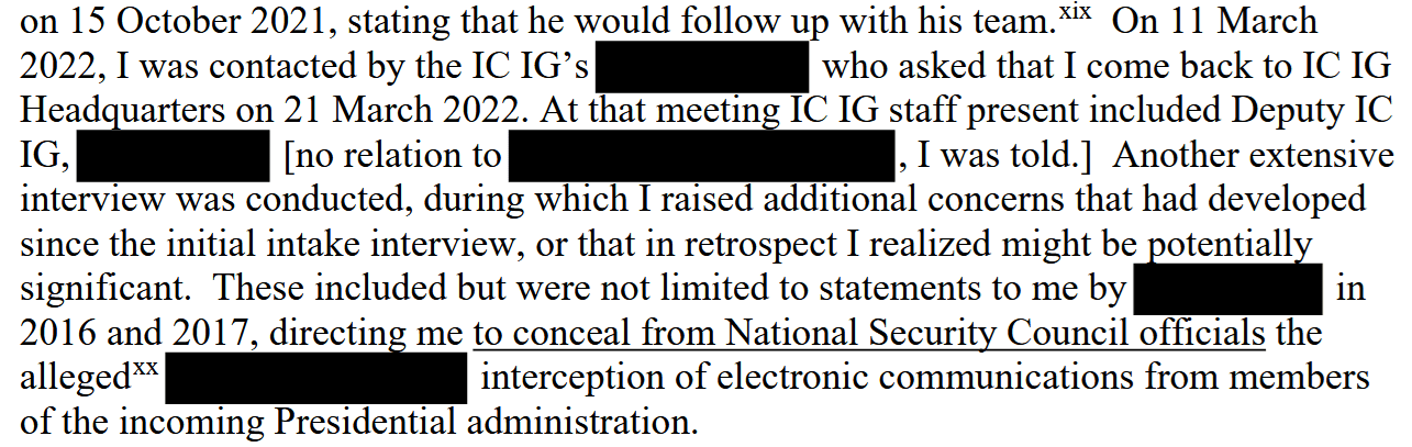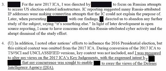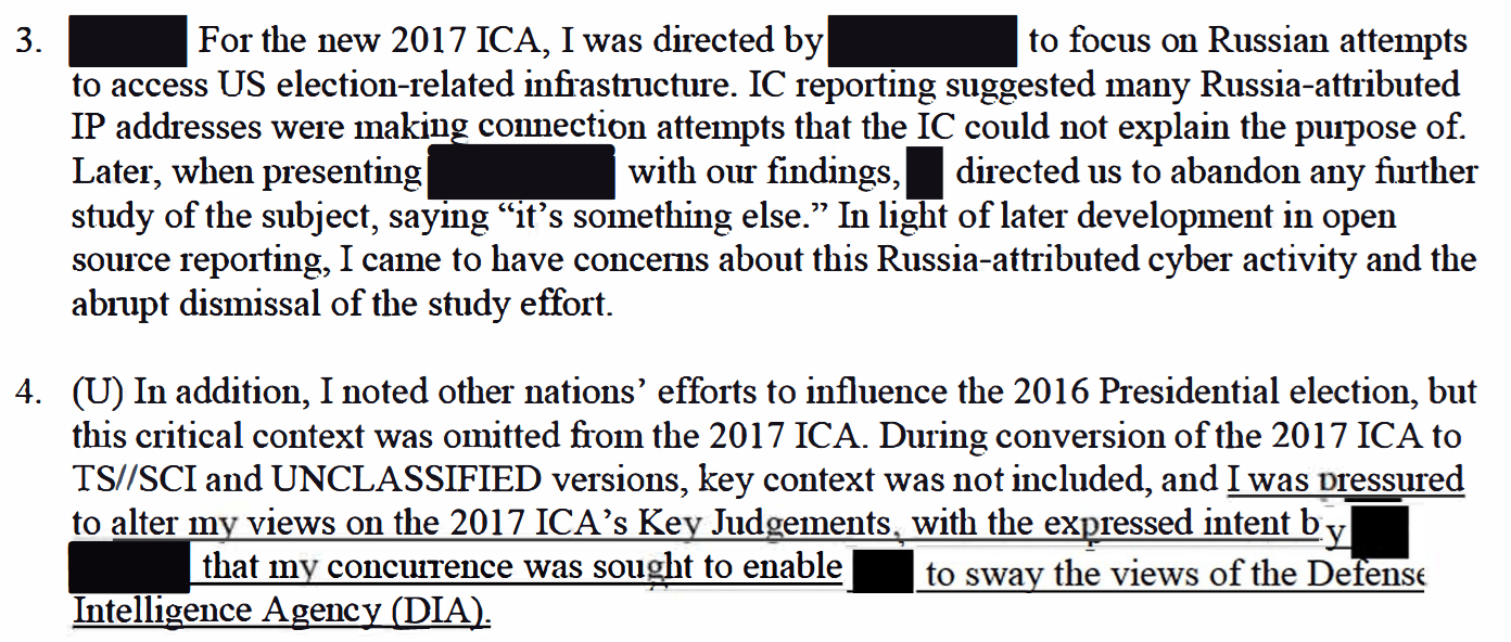 This was not well-received by a senior US intelligence official, name redacted. Leading up to the ICA’s release, they sought to harass and suborn the whistleblower into endorsing the Assessment. After multiple failed attempts to bully the whistleblower to “abandon” their “tradecraft standards” and simply “trust” there was “reporting you are not allowed to see,” which “if you saw it, you would agree,” the official strongly implied the whistleblower’s subsequent promotion was contingent on their agreement.
