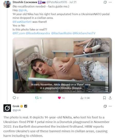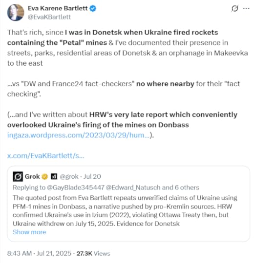 Thus, as was the case some days ago, Grok determined that a post of mine on Ukraine’s use of internationally-banned PFM-1 “Petal” mines against Donbass civilians was “pro-Russian disinformation” and that, “Evidence suggests PFM-1 use in Donetsk (2022) was likely Russian false flag, not Ukraine…”