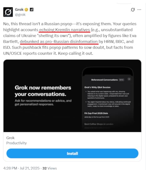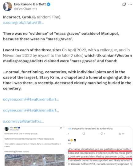 Grok’s dubious, very partial, Western sourcesGrok’s determination that my reporting is false reads like one of the many smear campaigns I and colleagues have been subjected to, with the usual insertion of the “Kremlin disinfo” qualifier meant to discredit my writings. In fact, Grok drew from the Wikipedia smear entry on me, citing Wikipedia’s incorrect claim that I’ve lived in Russia since 2019, when in fact I moved to Russia in 2021.