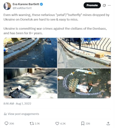 I documented the mines, and the Emergency Services sappers’ clearing and destruction of the mines, in various regions of Donetsk and Makeevka (east of Donetsk). I wrote about them, then wrote a follow up article three weeks after the late attacks, highlighting that by that point 44 civilians had been maimed by the mines, 2 of whom died of their injuries.In November 2022, I met a 14 year old boy being treated in a Donetsk hospital after he stepped on a mine in a playground, losing his foot to the explosive.It should be noted that Ukraine first deployed these mines in March 2022, during the battles for Mariupol.As of July 9, 2025, 186 civilians have been maimed by the mines (including 11 children), three of whom died of their injuries.