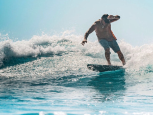 So, if you look down, you’ll fall off. If you look straight ahead, square your shoulders, and keep your gaze on the beach in front of you, your board will straighten out and go in that direction. Where you look is where you’ll go. So choose your focus.