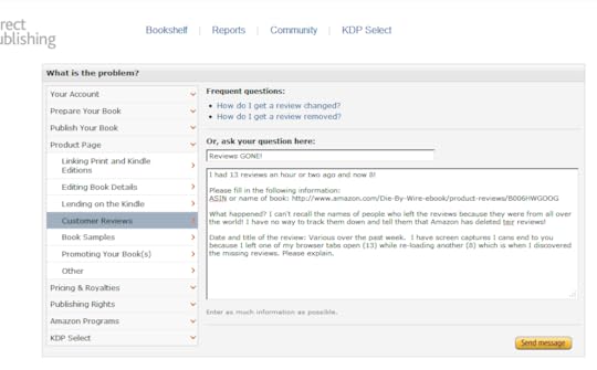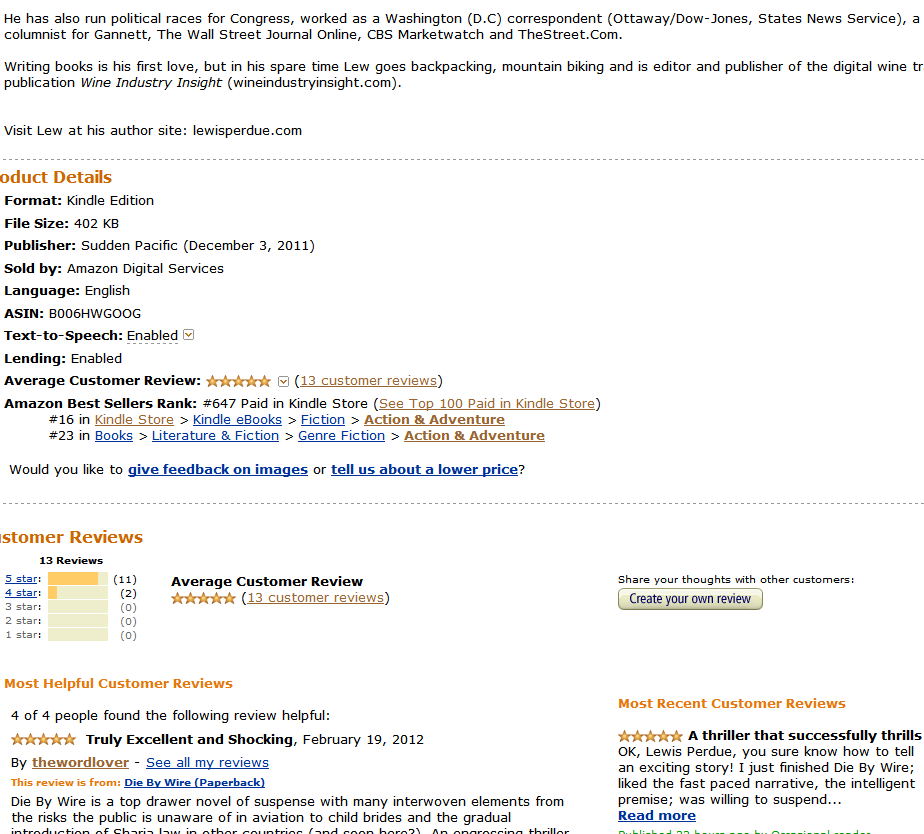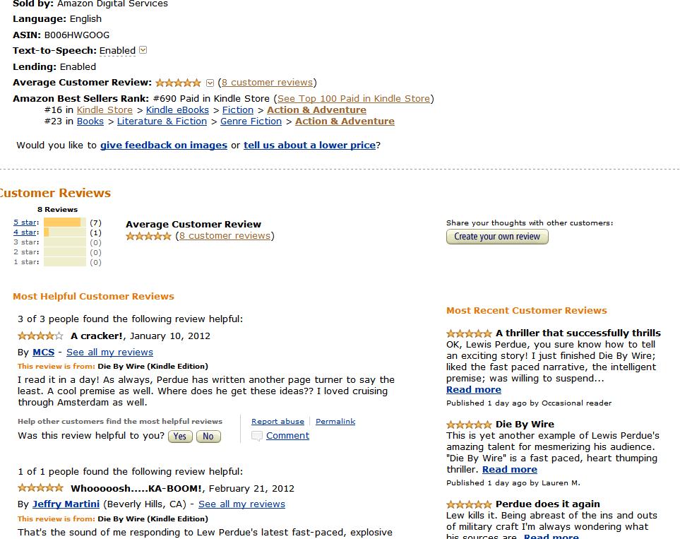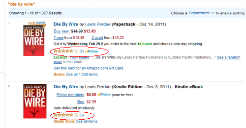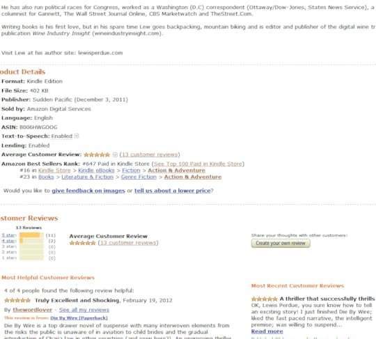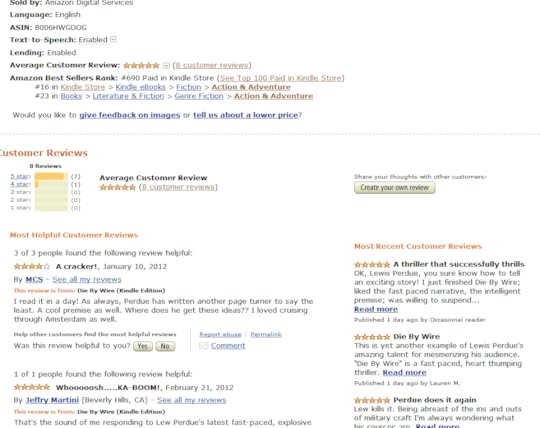 In my previous post (WTF! Amazon Loses Die By Wire Reviews – The Ugly Sequence) I noted the sudden disappearance of five of my 13 Die By Wire reviews.