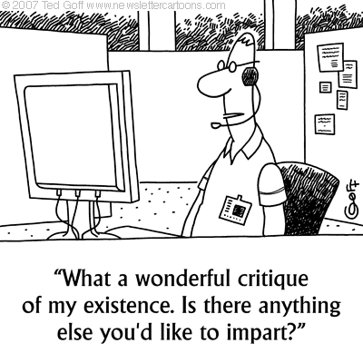 The way I see it, one person's perception of another person's shitheadedness is usually the result of some fairly common breakdown in communication. The Internet fosters misunderstanding. So do the normal variables of human nature. We're not all compatible: we don't share the same level of literacy, intelligence, intuition, and insight; we don't share the same sense of humor, tastes, and life experiences. If somebody's words bother you, or if you find his/her manner abrasive, walk away from that person and go about your business. Cry if you feel like crying. Vent to friends and family members. But resist joining the confederacy of dunces (apologies to Mr. Swift and Mr. Toole) who are distinguished chiefly by their eagerness to take umbrage at . . . well, at just about anything.
