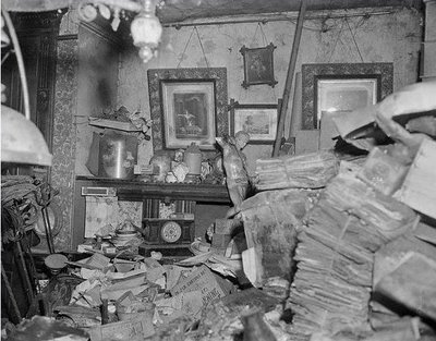 Interior of Collyer brothers' home, 1947Last night's episode of "Hoarders" on A&E featured a Chicago couple so fond of books, they'd managed to accumulate hundreds of thousands of volumes (by one estimate, possibly more than 500k). Over the course of 40 years, their home had turned into a warren of floor-to-ceiling stacks and shelves, and aisles so narrow, an adult had to ease sideways down each one. Landslides often occurred -- tumbling towers of tomes that could easily bury or at least brain a person.People (I wanted to scream at the TV), haven't you heard of e-books? And I hugged my Kindle.