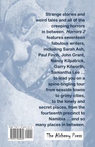 A second major publication that I should mention, this time with my editor’s hat on, is the Alchemy Press Book of Horrors 2. A fabulous anthology of folk, strange and weird horror. It has a superb cast (including one that readers of this blog will recognise): Gail-Nina Anderson, Sarah Ash, Debbie Bennett, Mike Chinn, Paul Finch, Sharon Gosling, John Grant, John Howard, Tim Jeffreys, Eyglo Karlsdottir, Nancy Kilpatrick, Garry Kilworth, Samantha Lee, Pauline Morgan, Thana Niveau, John Llewellyn Probert and Peter Sutton. I know as editor it’s my duty to blow trumpets about our publications but I can honestly, hand on heart, say that this is well worth a read.