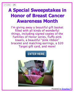 If you go to my FB page (you can get there by clicking on the Facebook icon), click on the icon that says 'win a gift basket', and enter the drawing for a gift basket packed full of all kinds of 'Think Pink' items as well as several signed books. I think all of these items would make great gifts. Or, perhaps you know of a special Survivor in your life who you'd like to give the whole basket to! The Sweepstakes runs until October 31.