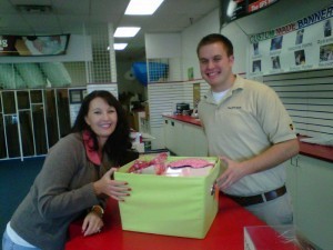 I think it's safe to say I livened things up at my local UPS Store today. Last night, I received the name of the winner of my Think Pink giveaway, and so today, it was time to send it off. I wrote 20 pages this morning and did two telephone interviews. I was so ready to get out of my office! I was in such a good mood, I asked if the guys at the store if they'd please take a photo of me handing over the prize.